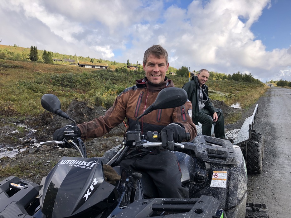 Etter lunsjen var det på med våte jakker og hansker. Så fortsatte arbeidet. Store mengder trær og kratt som var saget ned ble dratt bort til veien. Dette var tungt arbeid, og det tok tid. Mikael hadde stor henger med høye nettingsider. Fra Autohuset stilte Finn Erik Gustavsen med ATV med belter og henger. Odd Magne Grythe stilte med hjullaster til de større trestammene. Skikkelig fart i bortkjøringen ble det ikke før Ole (GT)Jørgen Magistad kom med traktor og realt stor henger. Han kjørte bort både busker og trær. Mannen som sto i hengeren og tråkket sammen buskas på hengern, havnet nederst på jordet til Syndinstøga sammen med buskene. Busker og trær vil bli kvernet til flis som skal legges i skiløypetraseene. De største trærne blir til ved.