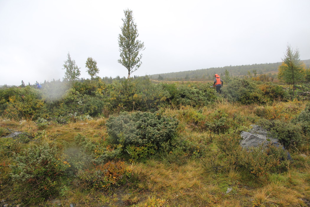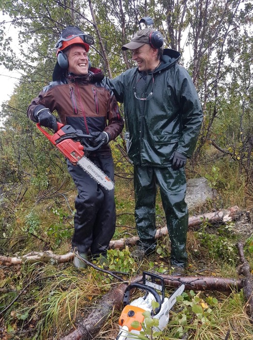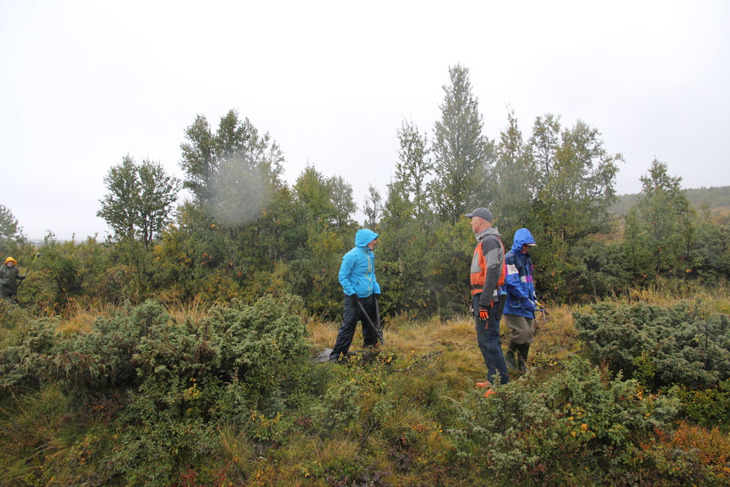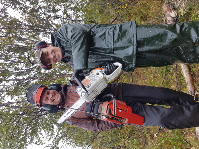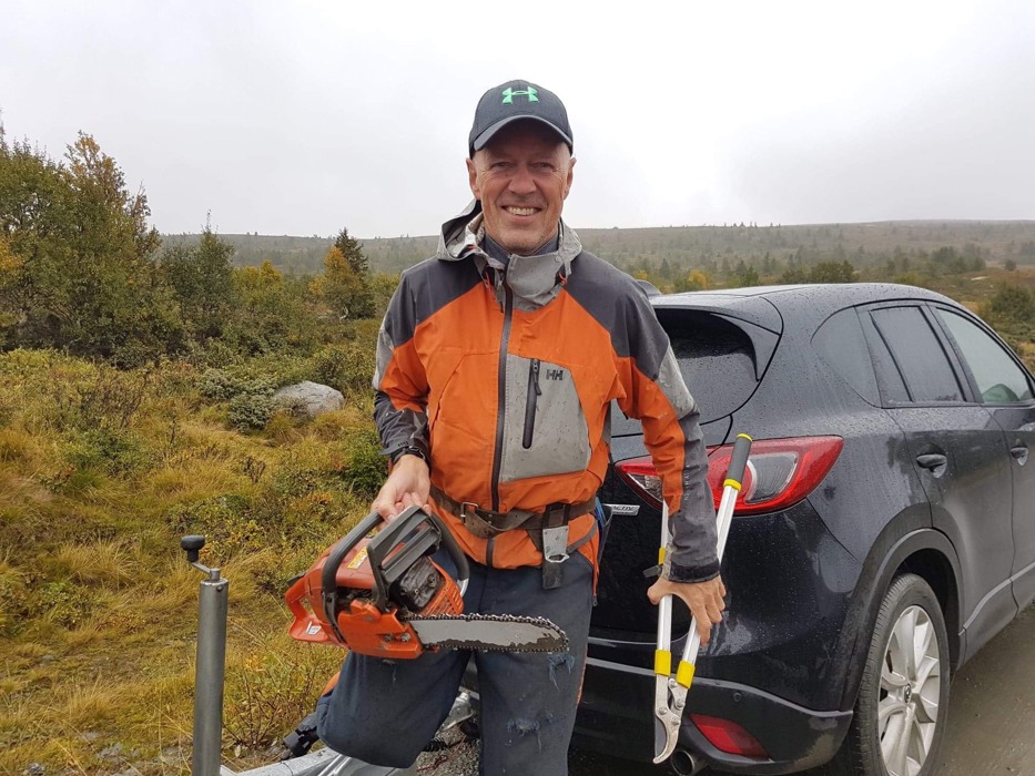 Det var meldt øsende regn og vind denne lørdagen, så vi var naturligvis spente på om noen i det hele tatt kom for å delta i dugnaden. Vår frykt viste seg å være helt ubegrunnet. Da Syndinposten ankom dugnaden satt det en herlig blanding av folk både fra støler, hytter og bygd klare til innsats. Dugnaden ble ledet av Mikael Fønhus som delte ut kart og informerte om områder som skulle ryddes. Godt planlagte og organiserte dugnader er gøy å være med på, og det ble en god start på dagen. Mange hadde tatt med eget utstyr. Det ble lånt ut utstyr til de som ikke hadde. Vi ble delt inn i tre ryddelag som begynte ryddingen langs veien sørover fra Syndinstøga. Vi ryddet på begge sider av veien. Bjørk og gran måtte vike for motorsaga, kratt ble effektivt klippet av med grensakser. Regnet øste ned, vannet steg og vinden var også med på leken, men med fint driv i arbeidet holdt vi varmen. Litt prat ble det også tid til. Rart kanskje, men trivelig var det.