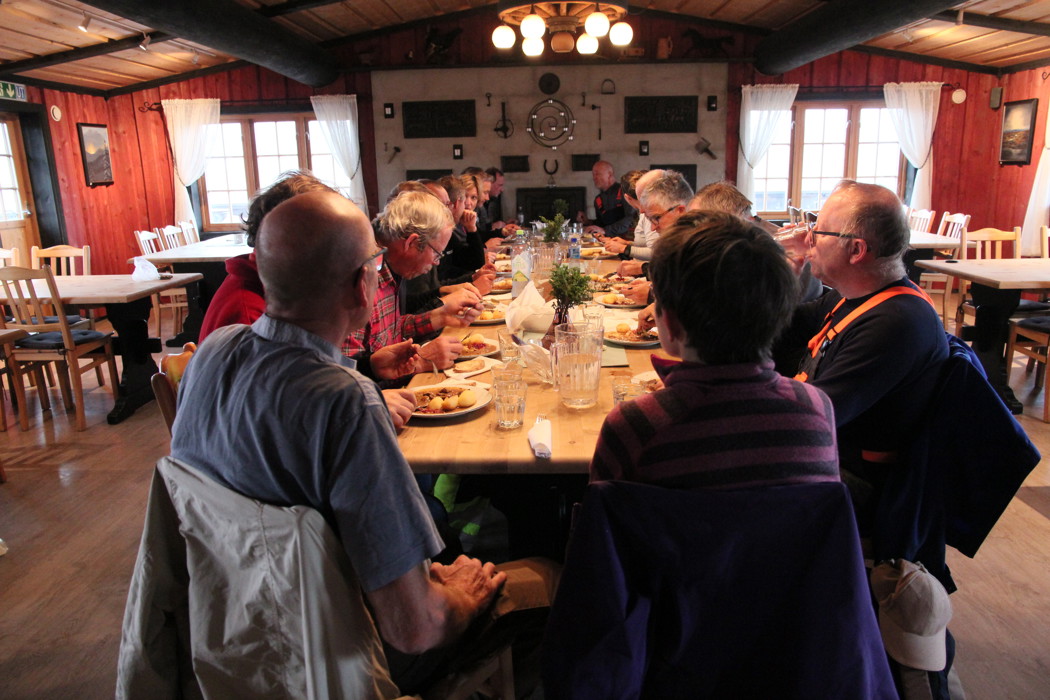Etter noen timers arbeid ble det lunsj for dugnadsgjengen på Syndinstøga, sponset av Tveitabru Bygg. Våte og kalde benket vi oss ved et langbord på Støga, og for en lunsj vi fikk! Deilig viltgryte med poteter, sopp og tyttebær. Kake og kaffe til dessert. Praten gikk livlig rundt bordet mens vi spiste, og det var trivelig med gamle og nye bekjentskaper.
