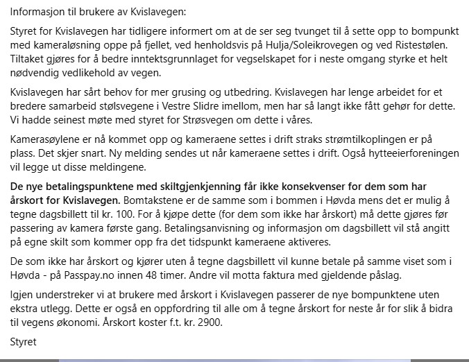Mange har sikkert observert de 2 nye bommene i Kvislavegen i løpet av høsten og det har gradvis kommet opp flere informasjonsskilt om betaling. I dag, 28. oktober 2025, ble bommene slått på.