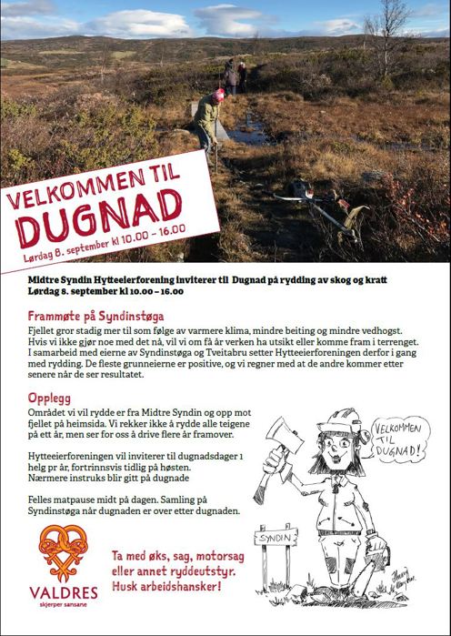 Hytteeierforeningen vil inviterer til dugnadsdager mot gjengroing 1 helg pr år, fortrinnsvis tidlig på høsten (det vil også være noen andre dugnader for rydding av stier og skiløyper). Nærmere instruks blir gitt på dugnaden. Felles matpause midt på dagen. Samling på Syndinstøga når dugnaden er over etter dugnaden. Ta med øks, sag, motorsag eller annet ryddeutstyr. Husk arbeidshansker!