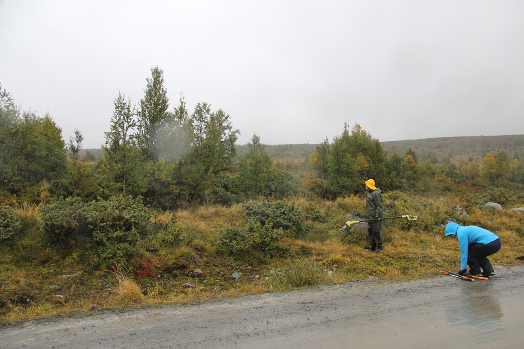Det var meldt øsende regn og vind denne lørdagen, så vi var naturligvis spente på om noen i det hele tatt kom for å delta i dugnaden. Vår frykt viste seg å være helt ubegrunnet. Da Syndinposten ankom dugnaden satt det en herlig blanding av folk både fra støler, hytter og bygd klare til innsats. Dugnaden ble ledet av Mikael Fønhus som delte ut kart og informerte om områder som skulle ryddes. Godt planlagte og organiserte dugnader er gøy å være med på, og det ble en god start på dagen. Mange hadde tatt med eget utstyr. Det ble lånt ut utstyr til de som ikke hadde. Vi ble delt inn i tre ryddelag som begynte ryddingen langs veien sørover fra Syndinstøga. Vi ryddet på begge sider av veien. Bjørk og gran måtte vike for motorsaga, kratt ble effektivt klippet av med grensakser. Regnet øste ned, vannet steg og vinden var også med på leken, men med fint driv i arbeidet holdt vi varmen. Litt prat ble det også tid til. Rart kanskje, men trivelig var det.