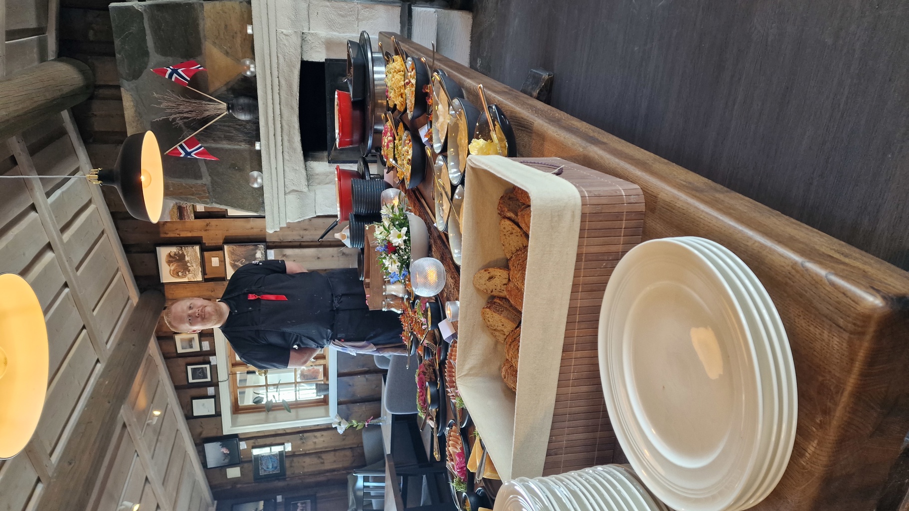 Syndinstøga tilbyr koldtbord fra kl. 14. Dette måtte vi være med på. Etter en vindfull spasertur til Støga, er det godt å sette seg ned ved et vakkert pyntet bord. Servietter i rødt-hvitt-og-blått, og deilig mat dandert på nydelig vis midt i lokalet. Gjestene strømmer på, alle kledd i bunad. Vi ser både ekte bunader og «fjell-bunad». Menyen består av Støgas karbonader m/gratinert løk, roastbeef på kalv, servert med jalapeno-remulade, landkylling med maispure og soltørket tomat, skagenrøre med krutonger, husets røkte ørret, servert med dillmajones, spanske kjøttboller, spekemat, rømmegrøt, eggerøre, potetsalat og brød m/aioli, rømme og smør. Mmmmmm, dette er godt! Kokken Thomas overvåker det hele, fyller på litt her, dytter litt på maten der, passer hele tiden på at fatene er fylt med godsaker.